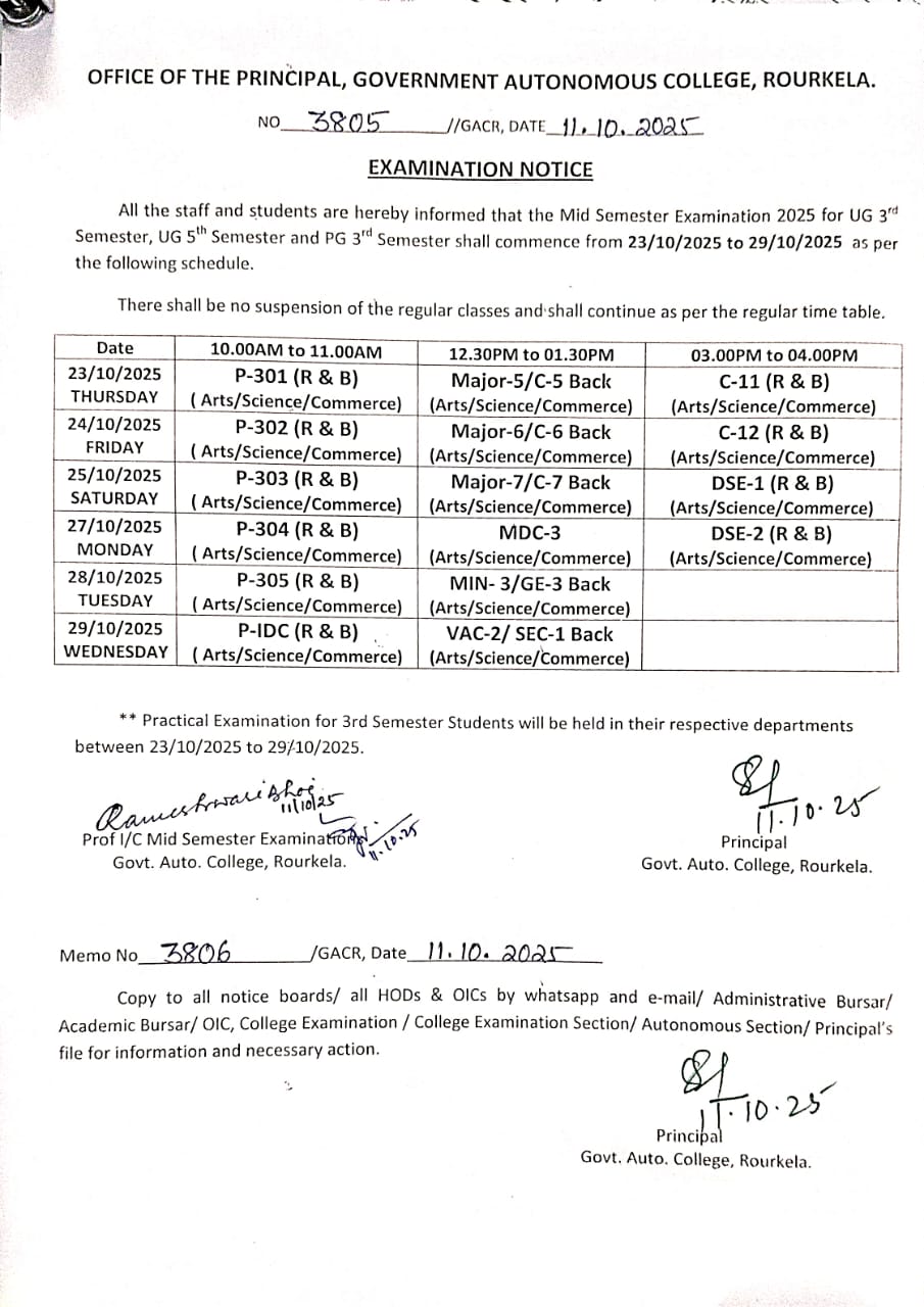 Mid Sem examinaion notice for UG 3rd, UG 5th and PG 3rd Semester Students