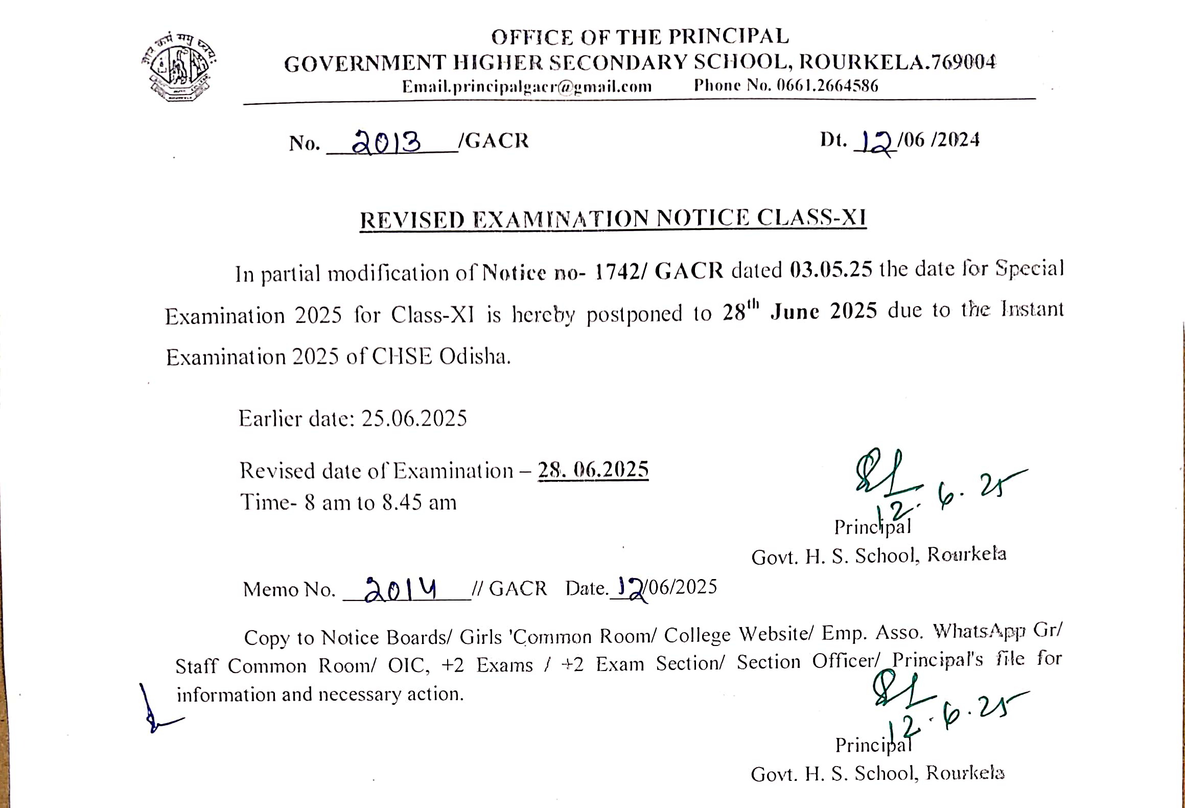 Revised Examination Notice for Class-XI