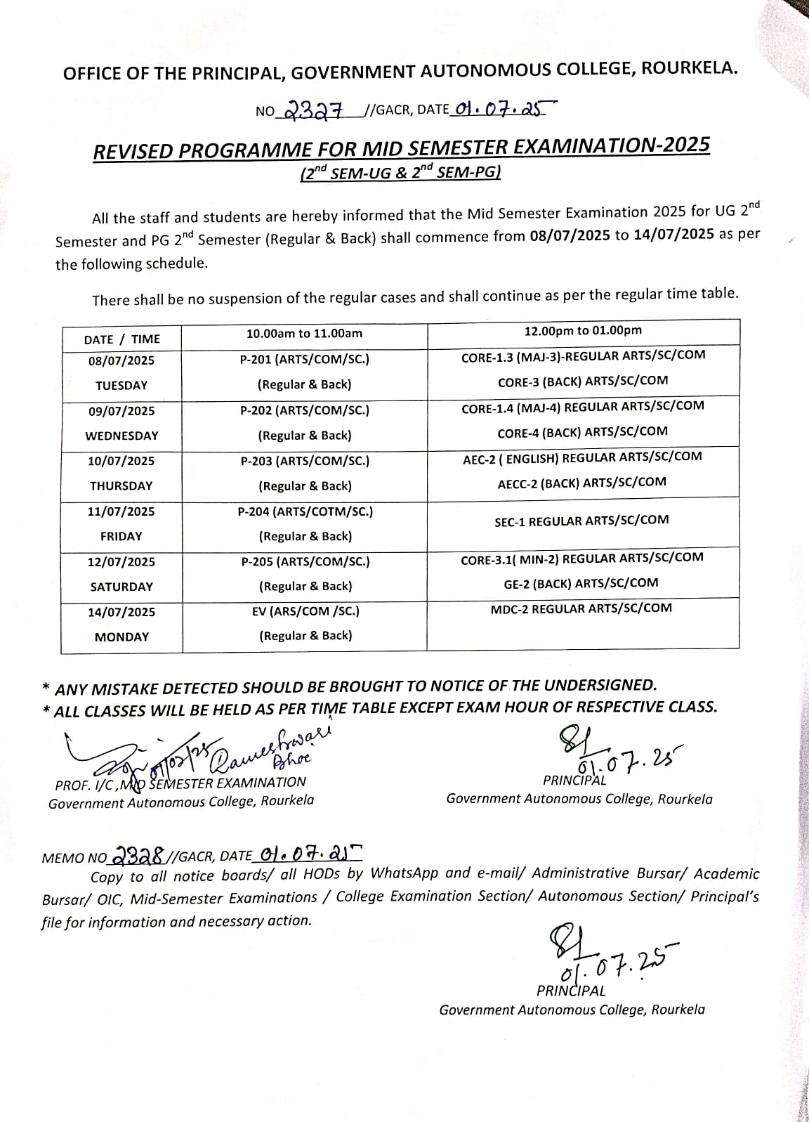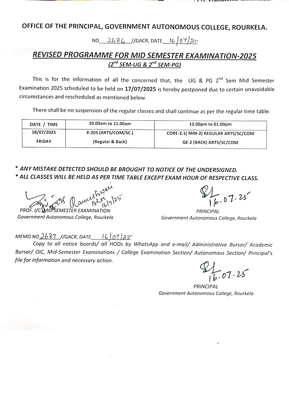 Revised Mid Sem examinaion notice for UG 3rd, UG 5th and PG 3rd Semester Students
